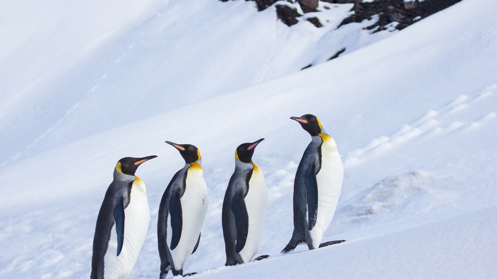 Kuningas pingviinit harkitsevat lumen Heard Islandilla, Antarktikassa.