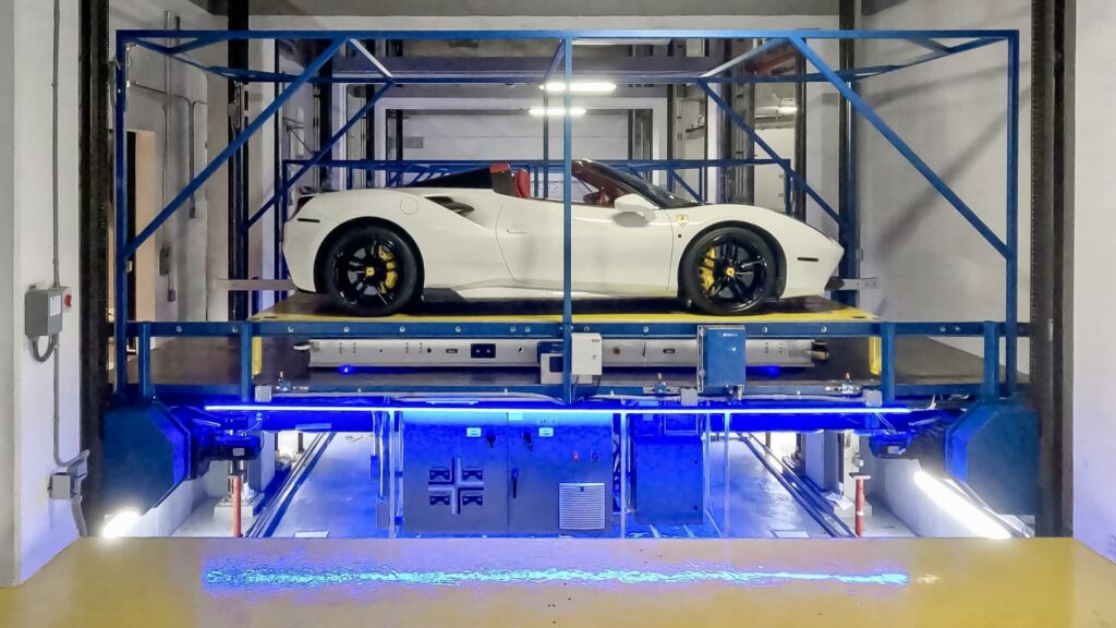 Automaattinen ohjattu ajoneuvo tai AGV kuljettaa Ferraria PARKPLUS-pysäköintijärjestelmän kautta.