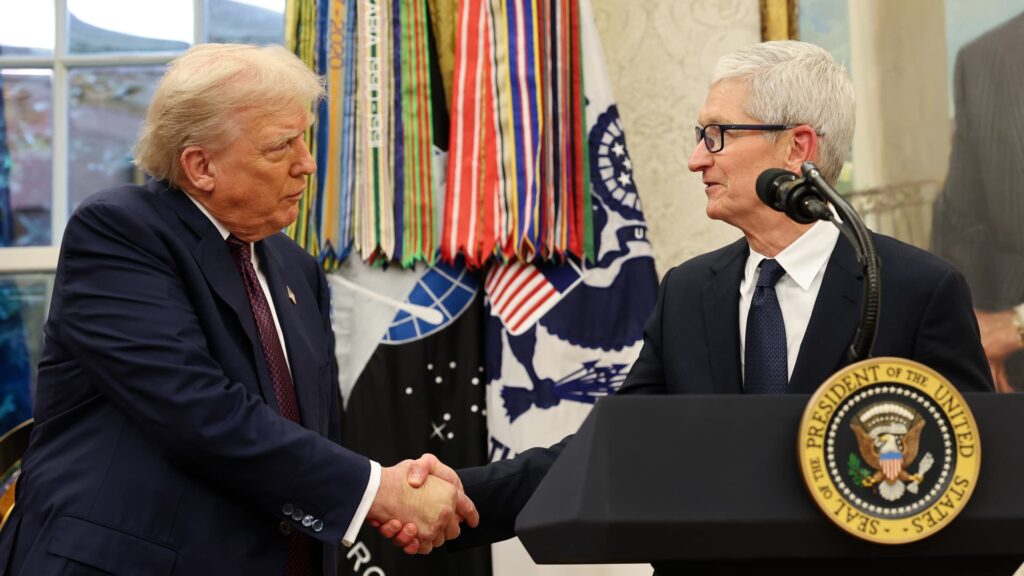 Applen toimitusjohtaja Tim Cook (R) kättelee Yhdysvaltain presidentti Donald Trumpin kanssa Valkoisen talon soikeassa toimistossa 6. elokuuta 2025 Washington DC: ssä.