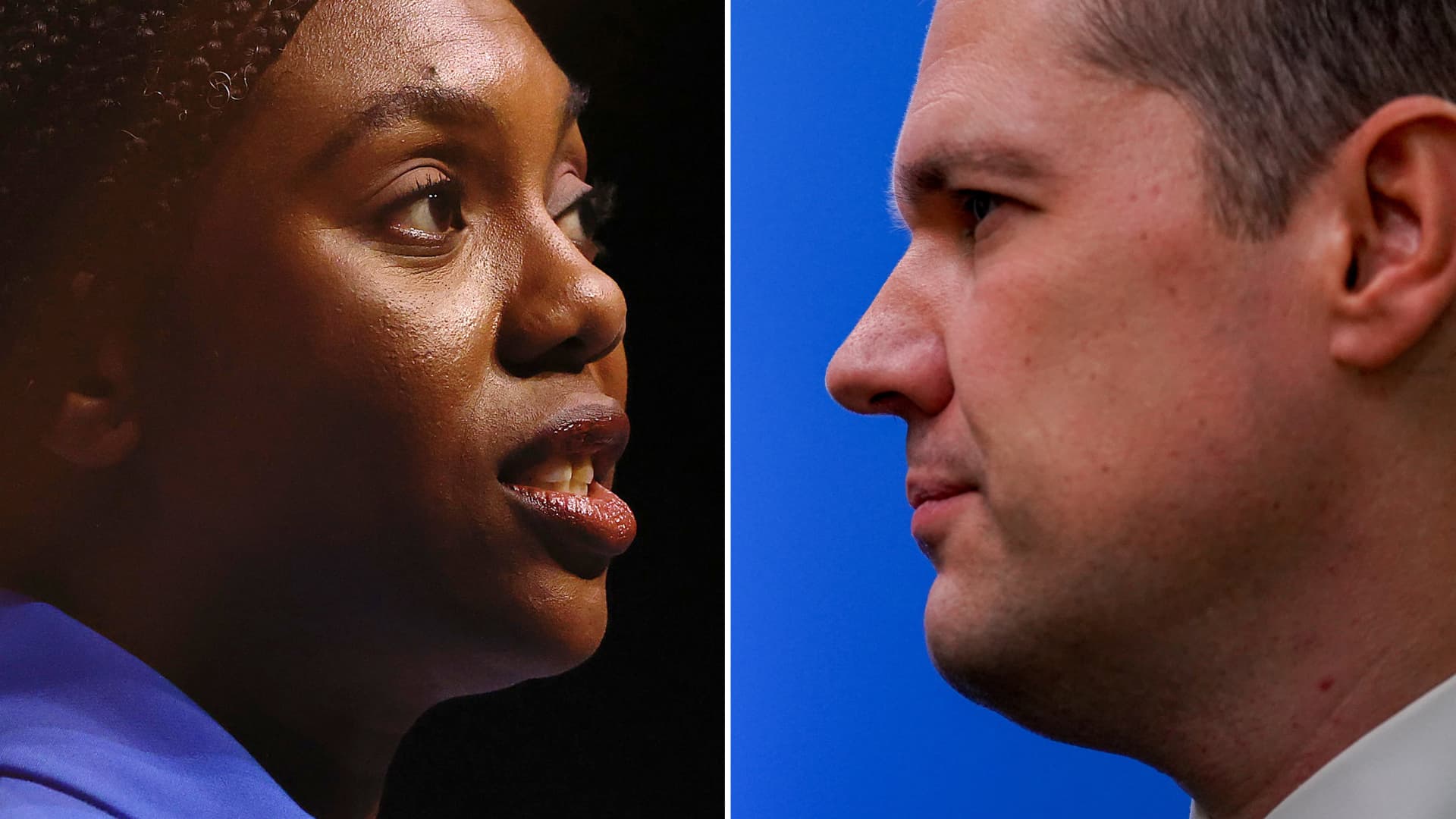 Yhdistyneen kuningaskunnan konservatiivipuolueen johtoehdokkaat Kemi Badenoch (V) ja Robert Jenrick (R).