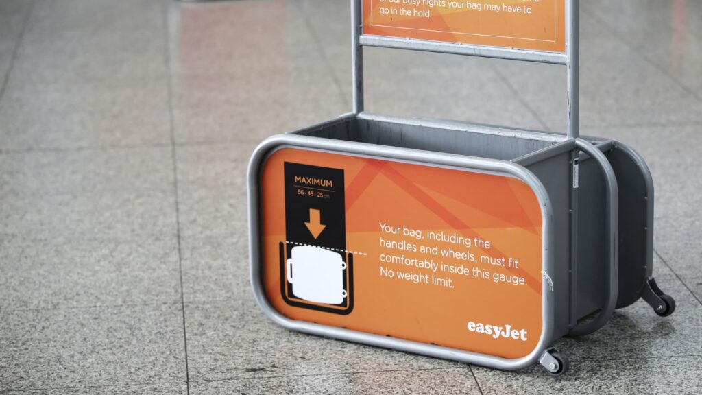 Käsimatkatavaroiden mittamittari seisoo Easyjet Plc:n lähtöselvitysalueen vieressä Stanstedin lentokentällä, jota operoi Manchester Airports Group (MAG), Lontoossa, Isossa-Britanniassa keskiviikkona 7. elokuuta 2013.