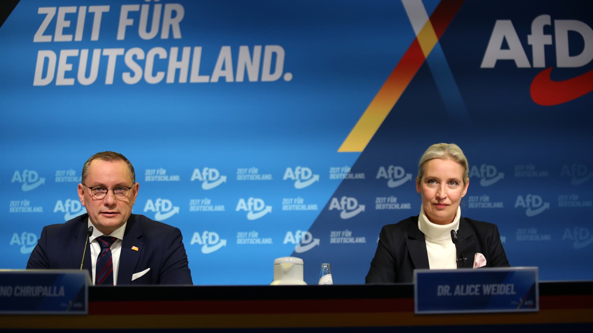 Media haastatteli 7. joulukuuta Alice Weideliä, äärioikeistolaisen Vaihtoehto Saksalle -puolueen (AfD) johtajaa, ja Tino Chrupallaa, Alternative for Germany -puolueen johtajaa. Vuodet Berliinissä, Saksassa.
