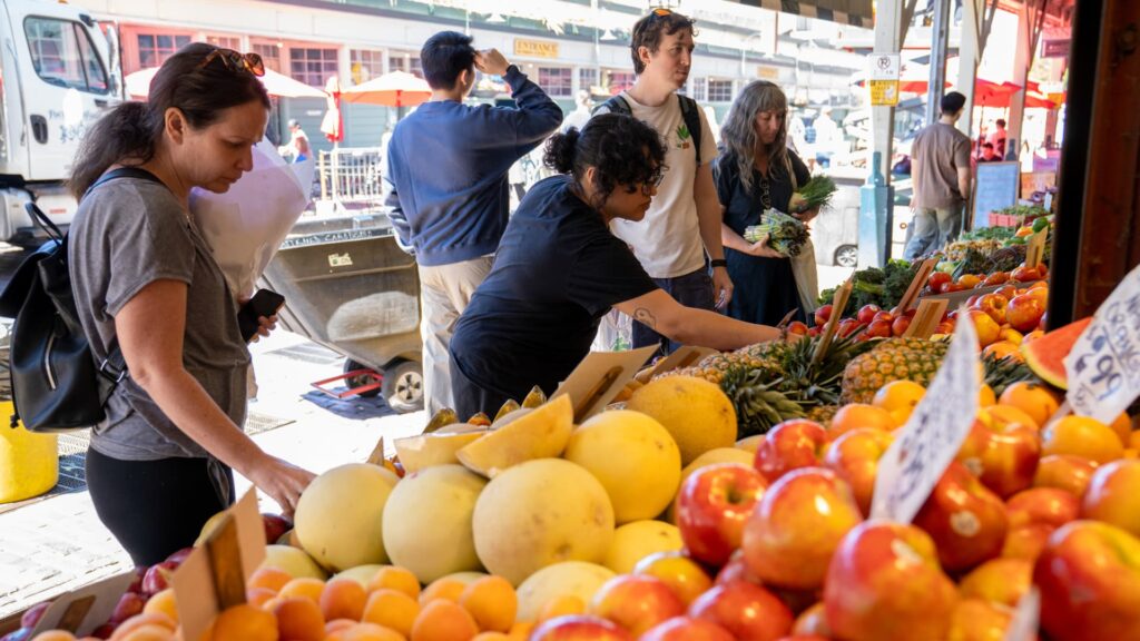 Ostajat katsovat hedelmiä myytävänä Frank’s Quality Produc -yrityksessä Pike Place Marketissa Seattlessa, Washingtonissa, Yhdysvalloissa, keskiviikkona 28. toukokuuta 2025.