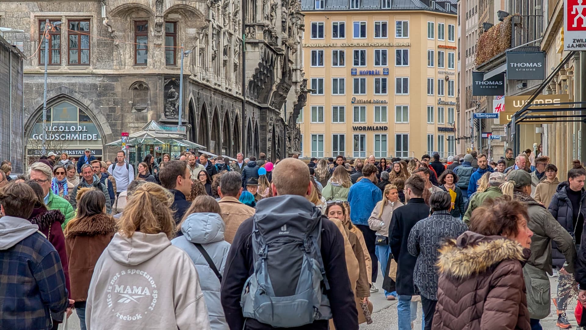 Väkijoukot jalankulkijoita ja ostajia kävelevät Weinstrassea pitkin Marienplatzia kohti Münchenissä, Saksassa 14. maaliskuuta 2026.