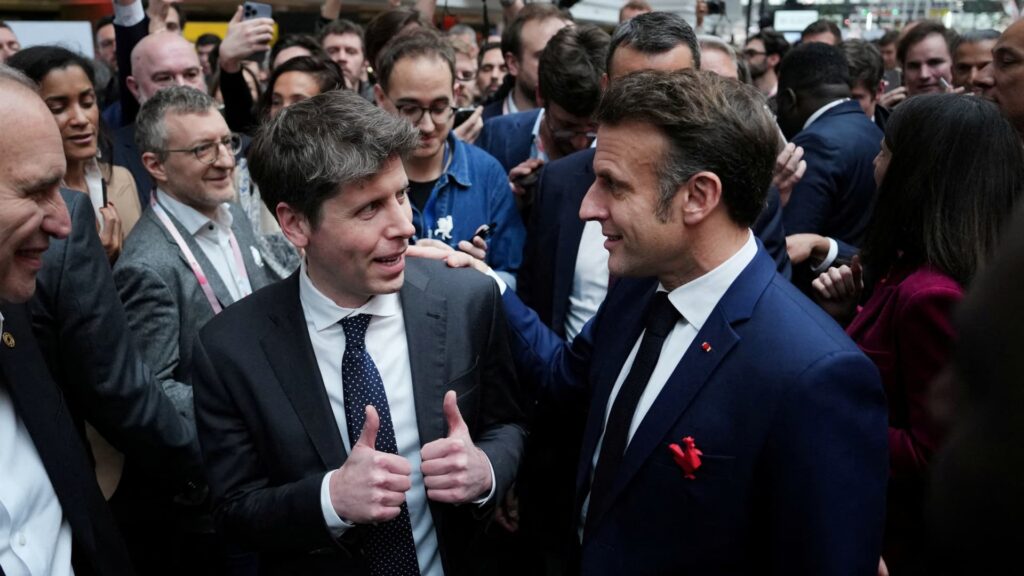 Openain toimitusjohtaja Sam Altman puhuu ranskalaisen presidentin Emmanuel Macronin kanssa Station F: llä, tapahtuman aikana tekoälyn toimintatapakokouksen sivussa Pariisissa, Ranskassa, 11. helmikuuta 2025.