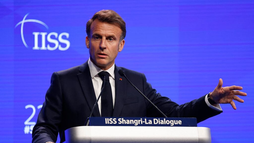 Shangri-La-vuoropuhelussa vuoden 2025 Shangri-La-vuoropuhelussa Macron vaati voimakkaampia siteitä Euroopan ja Indo-Tyynenmeren “uuden erityisen suhteen” välillä. Hän painotti, että molemmat ryhmät kohtaavat “pitkäaikaisten liittoutumien potentiaalista eroosiota” ja maiden uhkaa, jotka kilpailevat valvontaan tai turvautumaan voimaan, vetäen suoria rinnakkaisia Kiinan Etelä-Kiinan meren edistymisen ja Venäjän hyökkäyksen välillä Ukrainaan.