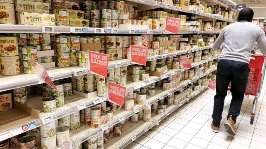 Mies ampuu ostoskorinsa, joka on täynnä ruokahyppyjä ja kävelee kerran purkitettujen vihannesten edessä “alhaisella hinnalla” -tarroilla Auchan -Storm -markkinoilla Guilherand Grangesissa, Ranskassa, 8. maaliskuuta 2025.