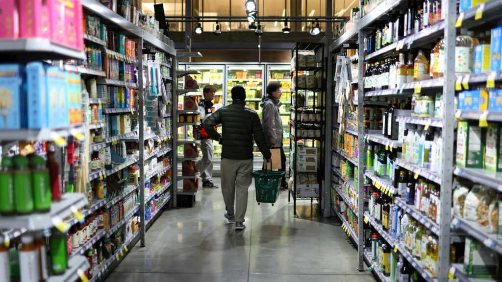 Ihmiset tekevät ostoksia supermarketissa New Yorkin Manhattanin alueella 20. helmikuuta 2025.