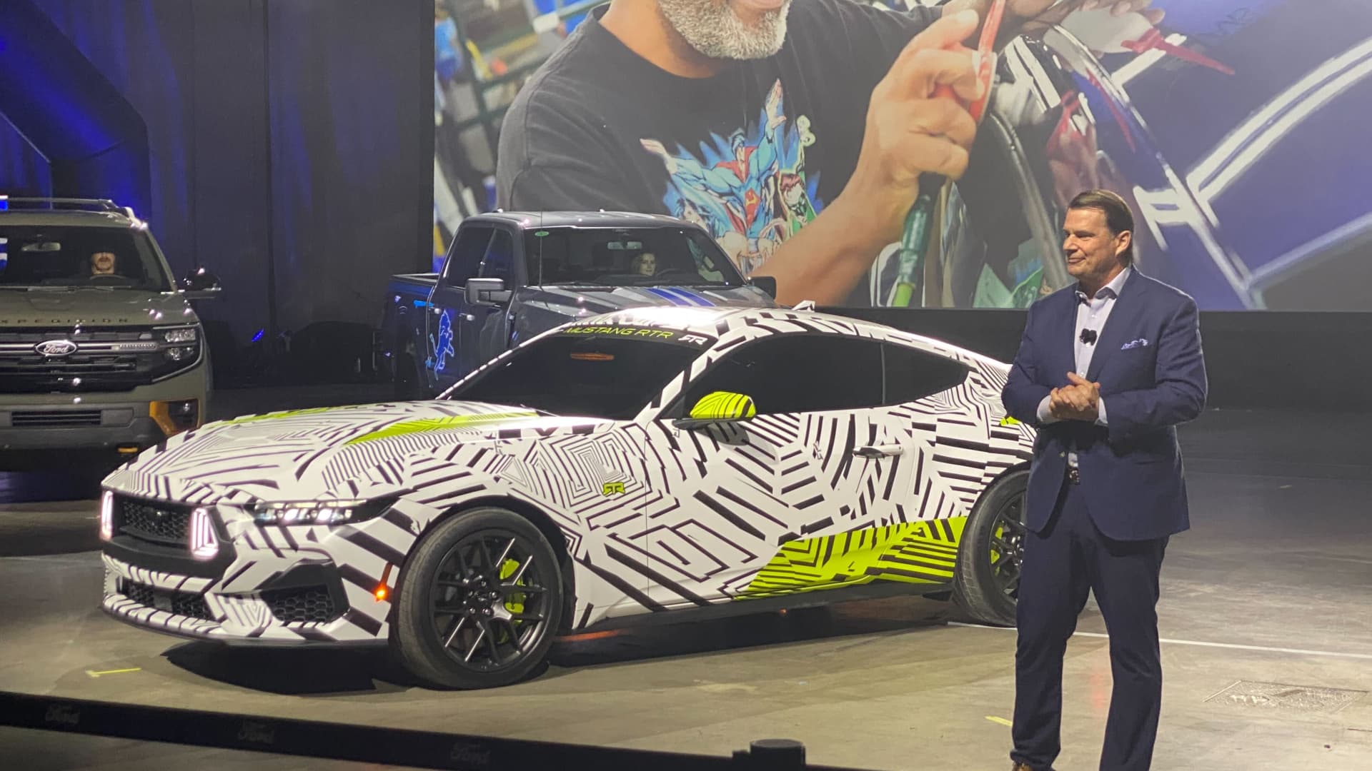 Ford Motorin toimitusjohtaja Jim Farley esittelee erikoisversiota Ford Mustang GTD:tä Detroitin autonäyttelyssä 9. tammikuuta 2024.