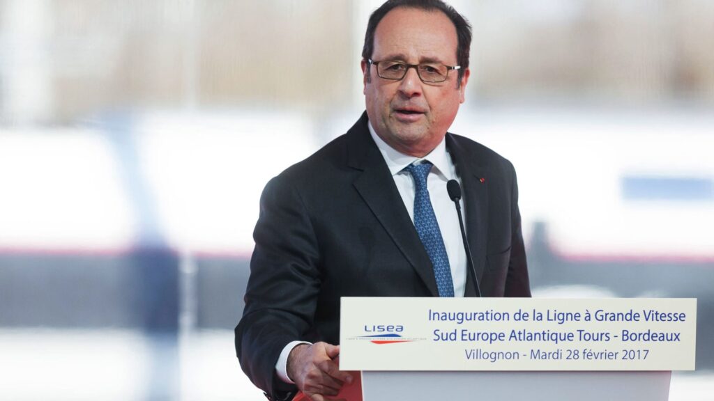 Ranskan presidentti Francois Hollande pitää puheen osallistuessaan Toursin ja Bordeaux’n yhdistävän uuden Sud Europe Atlantiquen (South Europe Atlantic) suurnopeusjunaradan avajaisiin 28. helmikuuta 2017 Villognonissa Keski-Ranskassa.