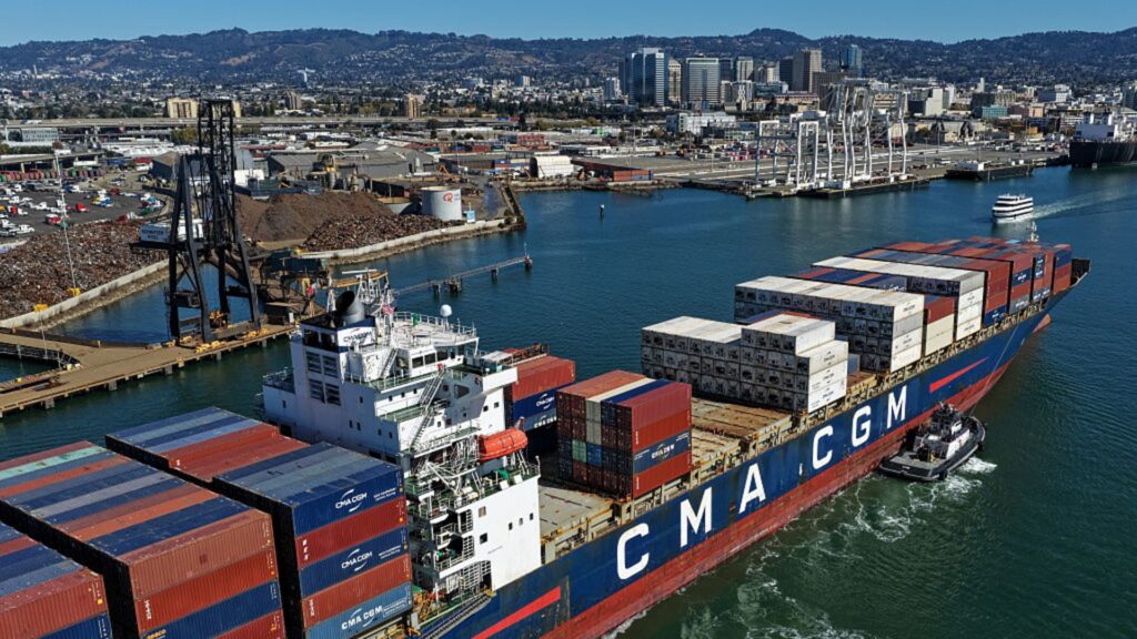 Ilmakuvassa konttialus saapuu Oaklandin satamaan 10. lokakuuta 2025 Oaklandiin, Kaliforniaan. Yhdysvaltain presidentti Donald Trump uhkaa asettaa Kiinan tuonnin tariffien tariffien lisäämisen valtavasti vastauksena Kiinan ilmoitukseen harvinaisten maametallien uusista vientivalvonnasta. Kiina hallitsee arviolta 70 prosenttia harvinaisten maametallien mineraalien maailmanlaajuisesta tarjonnasta.
