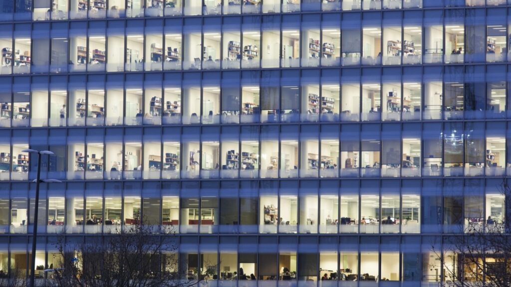 Työskentely myöhään, toimistorakennukset, finanssialue, Lontoo.
