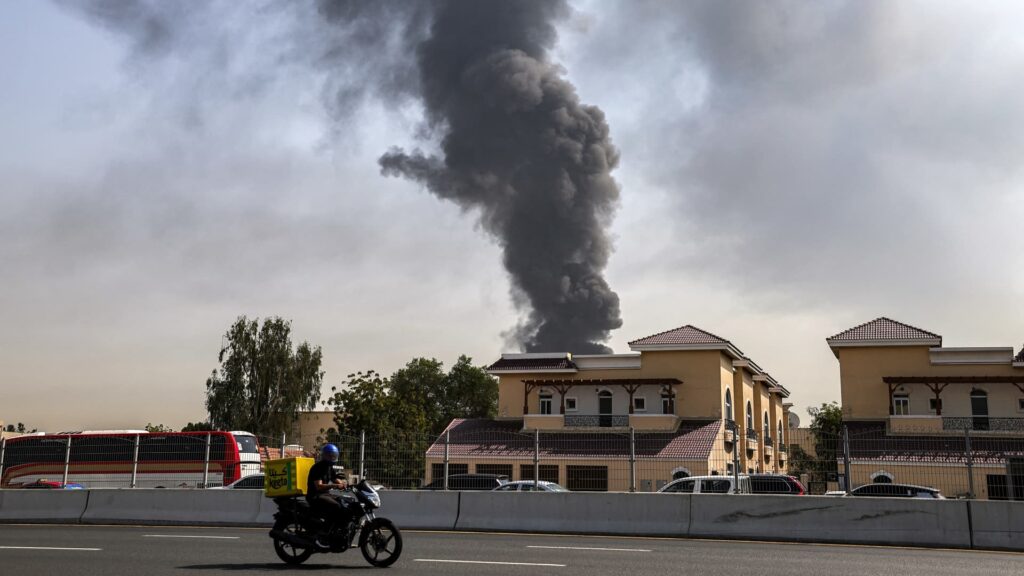 Savupiippu nousee jatkuvasta tulipalosta lähellä Dubain kansainvälistä lentoasemaa Dubaissa 16. maaliskuuta 2026. Lennot alkoivat vähitellen uudelleen Dubain lentokentällä 16. maaliskuuta, joka oli aiemmin maailman vilkkain kansainvälisten lentojen lentokentällä, lentoaseman pitäjä sanoi, kun “droneihin liittyvä tapaus” aiheutti polttoainesäiliön tulipalon lähistöllä Iranin jatkaessa Persianlahden hyökkäyksiään.