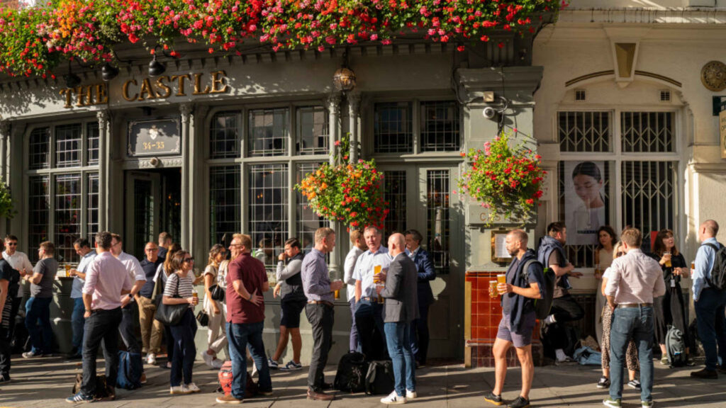 Miehet ja naiset viettävät aikaa päivän lopussa linnan pubissa Lontoossa, Iso -Britanniassa.