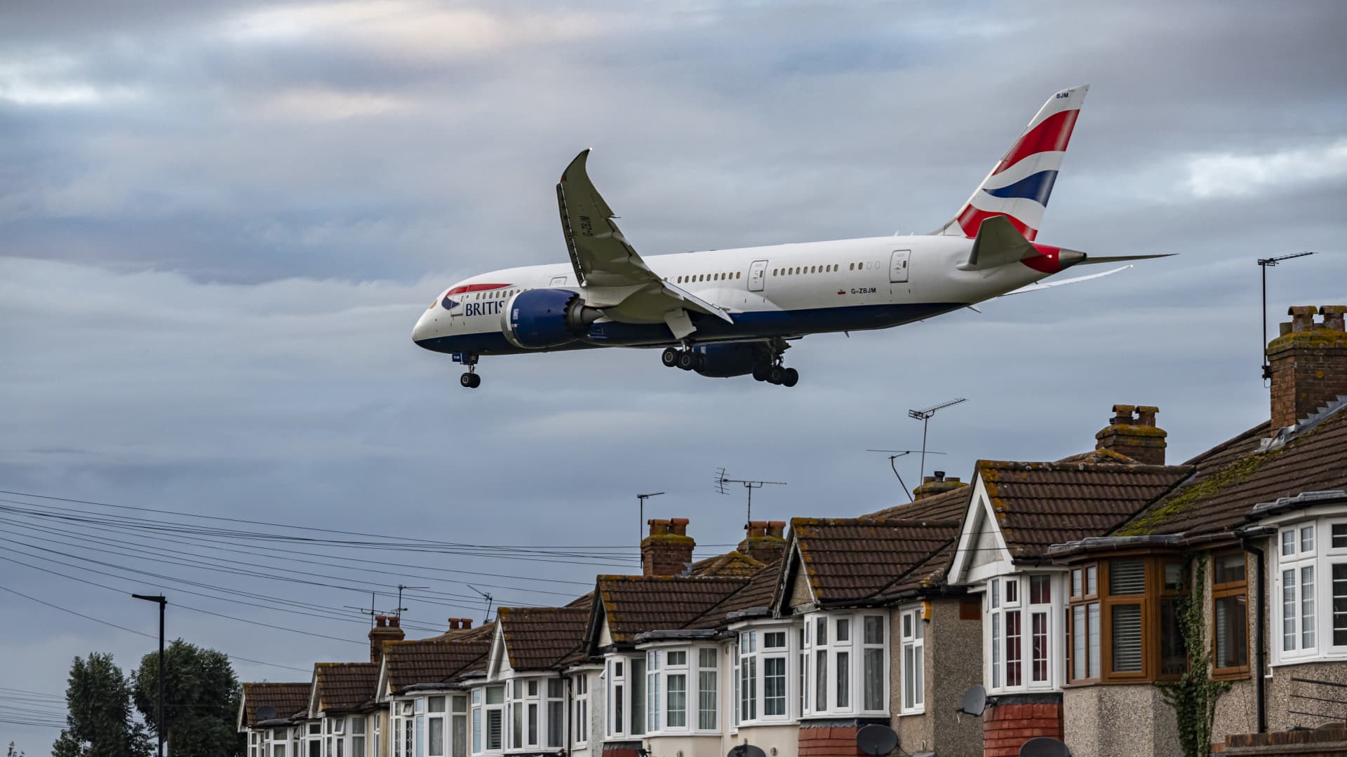 British Airways Boeing 787-8 Dreamliner -lentokoneet huomasivat lentävän lopullisella lähestymistavalla Myrtle Avenuen talojen kattojen yli Lontoon Heathrow’n lentokentän LHR: lle Isossa-Britanniassa.