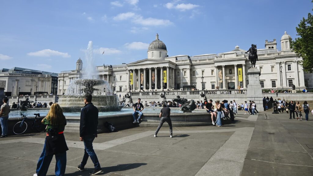 Ihmiset kävelevät Trafalgar -aukiolla Lontoossa 28. huhtikuuta 2025.