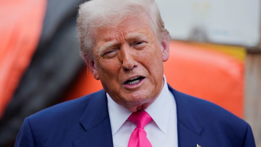 Yhdysvaltain presidentti Donald Trump puhuu tiedotusvälineille kiertueen aikana, joka on parhaillaan peruskorjauksia, Washington DC, Yhdysvallat, 24. heinäkuuta 2025.