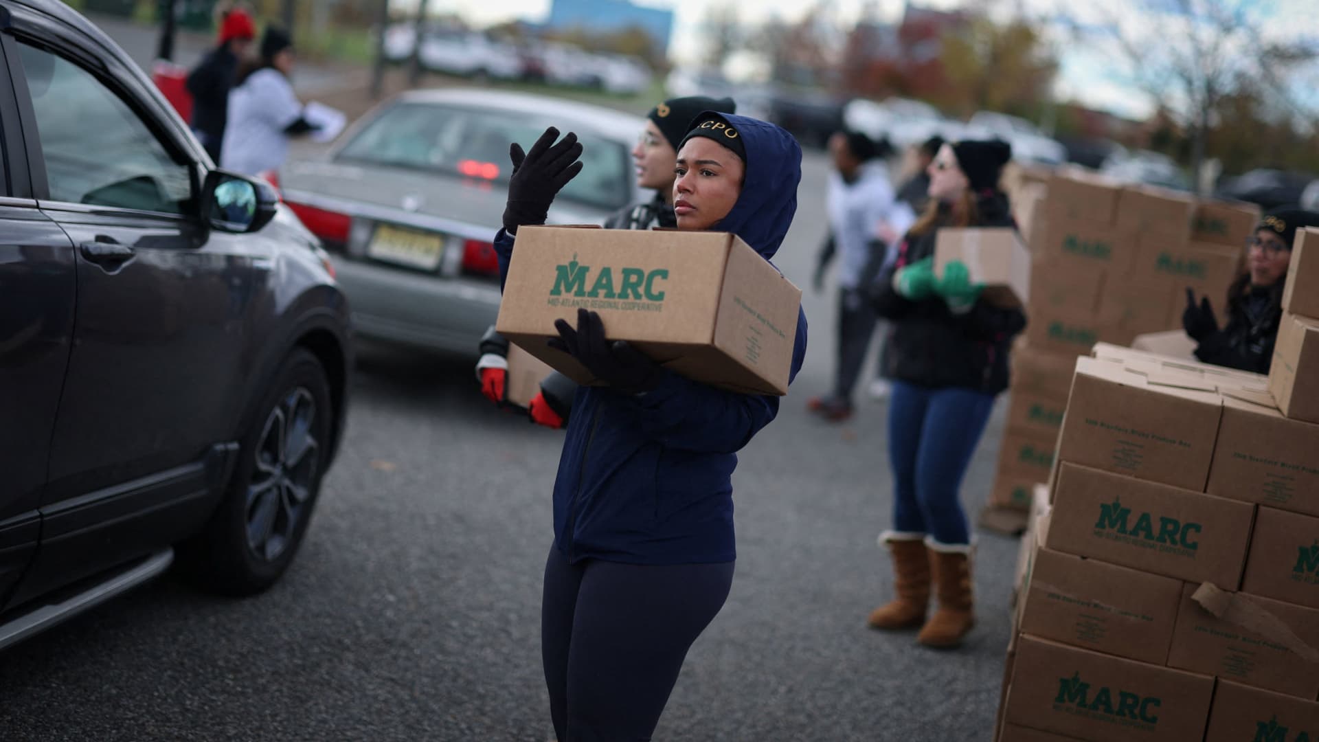 Vapaaehtoiset lataavat ruokalaatikoita autoihin New Jerseyn Community Foodbankin yhteistyössä Bergenin piirikunnan kanssa järjestämässä tilaisuudessa jakaakseen hätäruokaapua liittovaltion työntekijöille ja SNAP-saajille Yhdysvaltojen hallituksen seisokin aikana Leoniassa, New Jerseyssä, Yhdysvalloissa 6.11.2025.