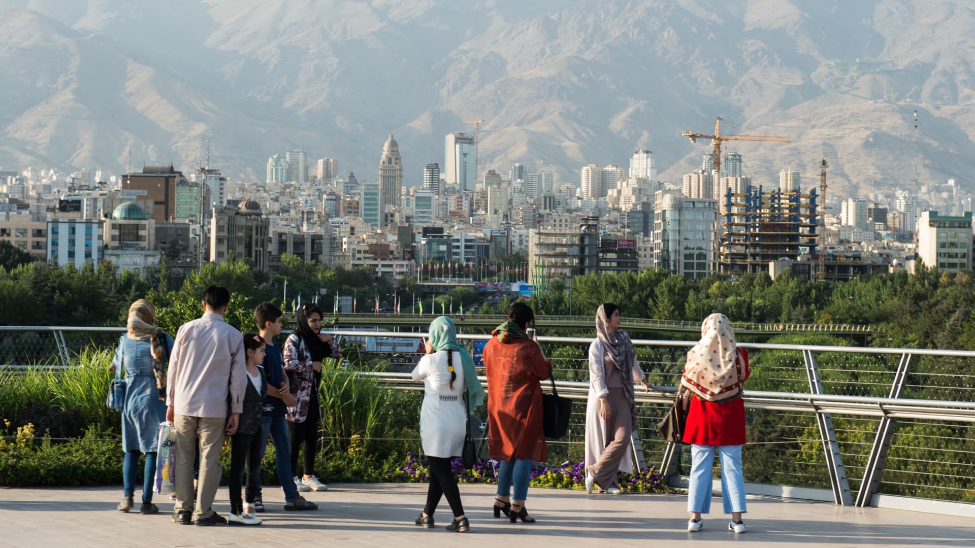 Jalankulkijat katselevat kaupungin horisonttia kävellessään Tabiatin siltaa pitkin Teheranissa, Iranissa lauantaina 4. elokuuta 2018.