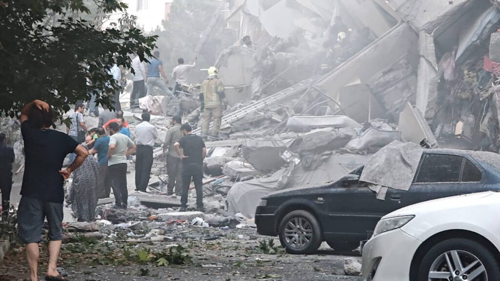 Ihmiset etsivät Nobonyad -aukion rakennuksia seuraten Israelin ilmaiskuja 13. kesäkuuta 2025 Teheranissa, Iranissa.