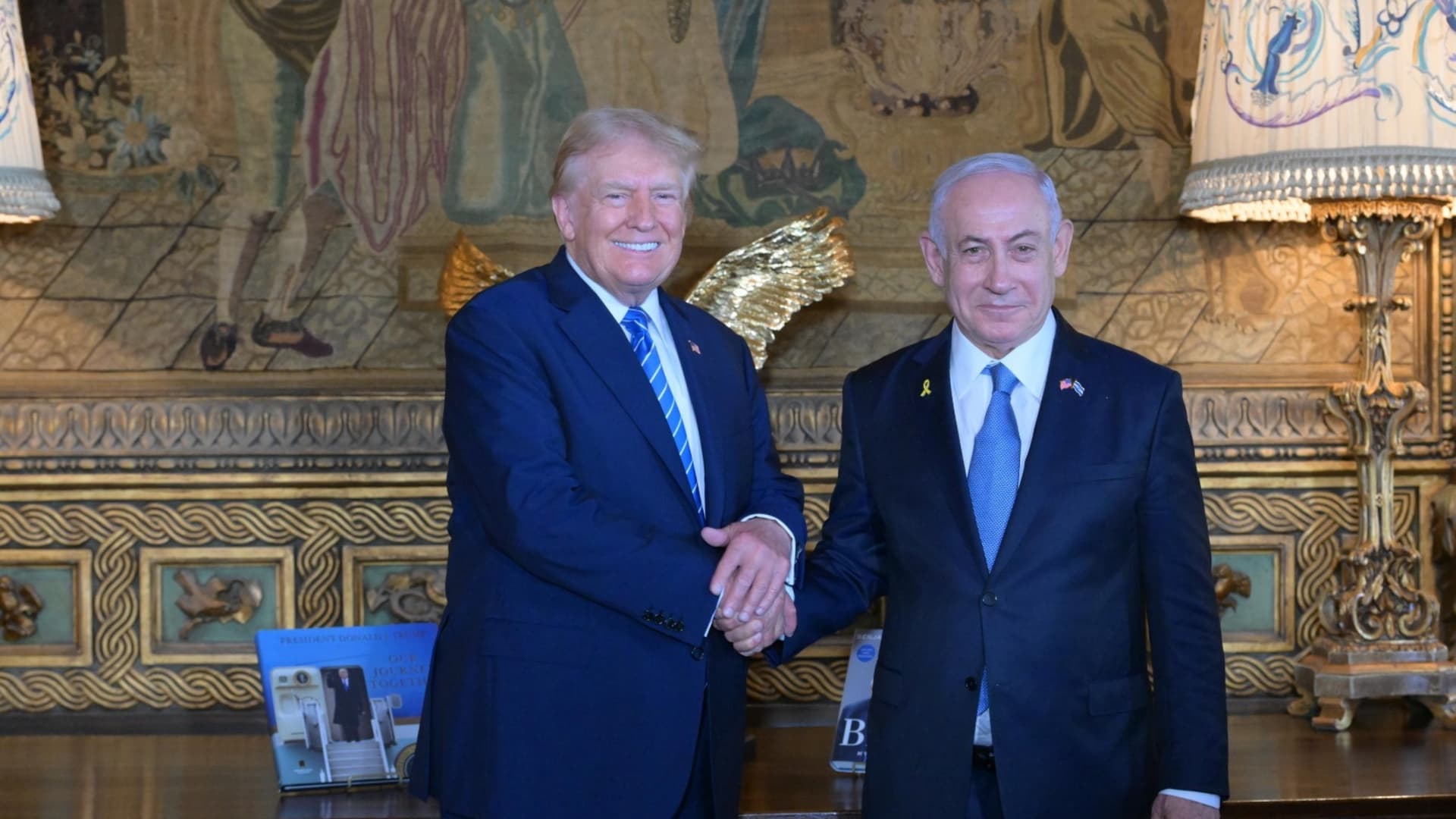 Yhdysvaltain entinen presidentti Donald Trump (L) kättelee Israelin pääministeriä Benjamin Netanyahua (R), kun he poseeraavat valokuvassa tapaamisessaan Mar-a-Lagon kartanolla Palm Beachissä, Floridassa, Yhdysvalloissa 26. heinäkuuta 2024.