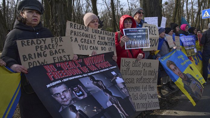 Mielenosoittajat kokoontuivat Yhdysvaltain Kiovin suurlähetystön ulkopuolelle toistaen, että yksi rauhanpisteistä on sotavankien vaihtaminen.