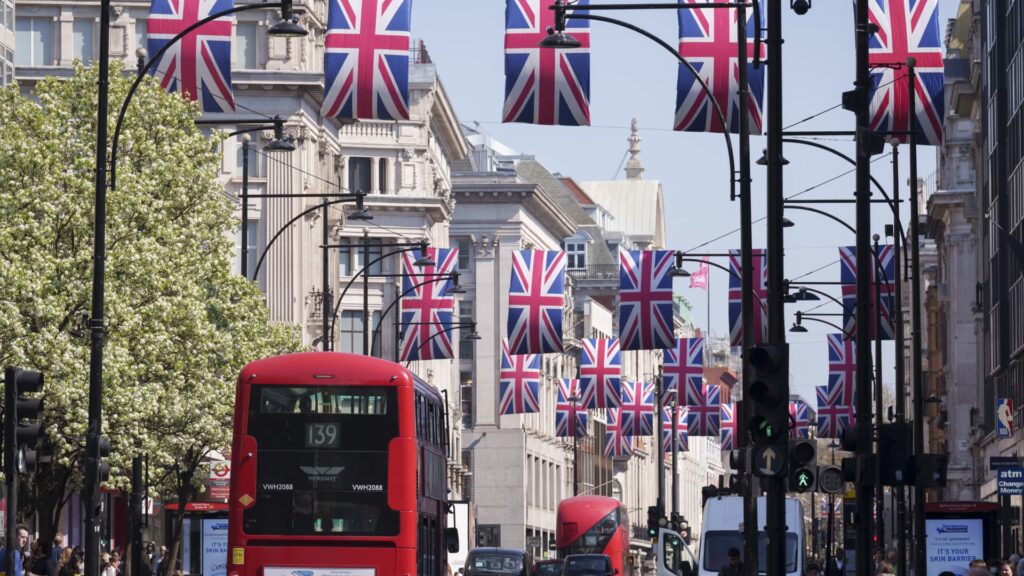 Ostajat viettävät Oxford Streetillä Union Jack -lippujen alla Lontoon West Endissä 3. huhtikuuta.
