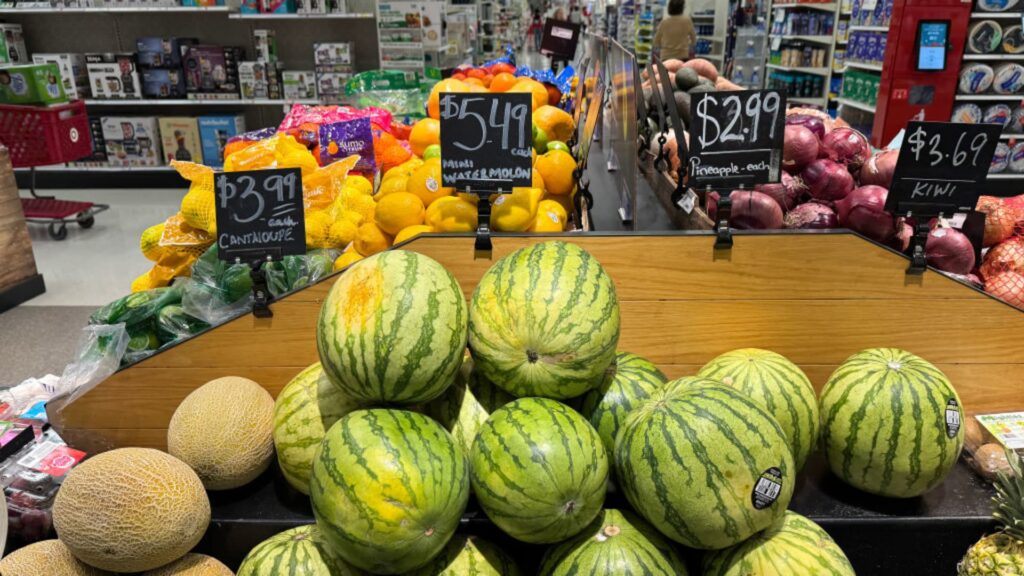 Meksikosta peräisin olevat vesimelonit ilmestyvät hyllylle kohdekaupassa 5. maaliskuuta 2025 Novatossa, Kaliforniassa.