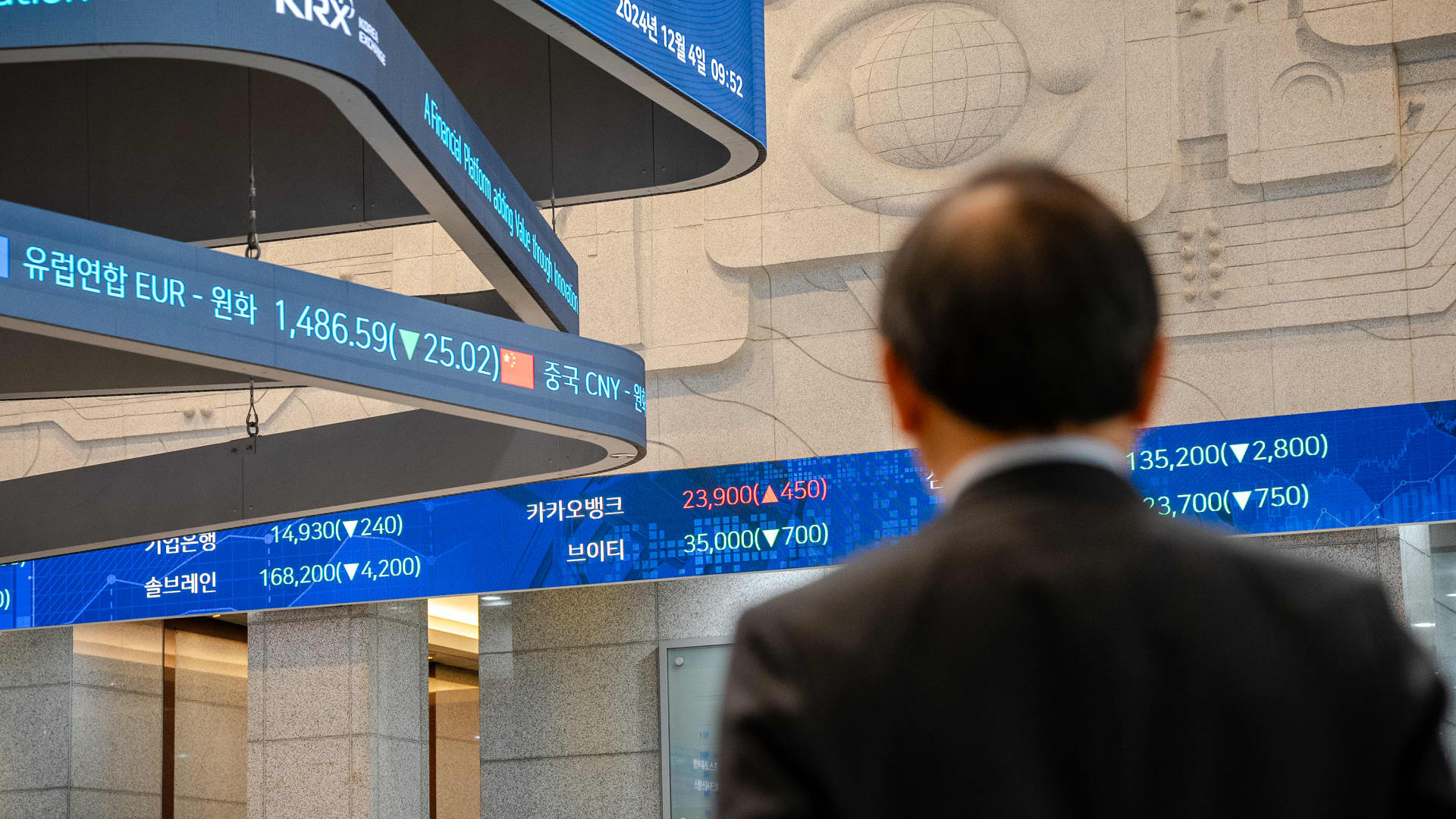 Vierailija katselee näyttöjä Korea Exchangen (KRX) pääkonttorissa Soulissa, Etelä-Koreassa, keskiviikkona 4. joulukuuta 2024.