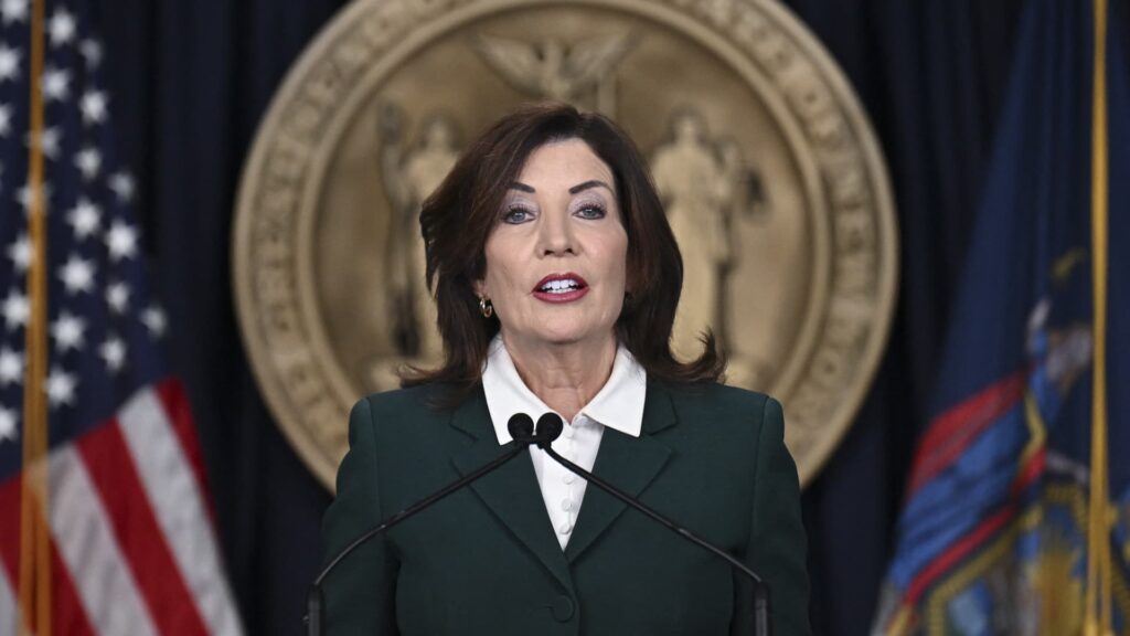 Kuvernööri Kathy Hochul puhuu lehdistötilaisuudessa toimistossaan New Yorkissa 14. marraskuuta 2024.
