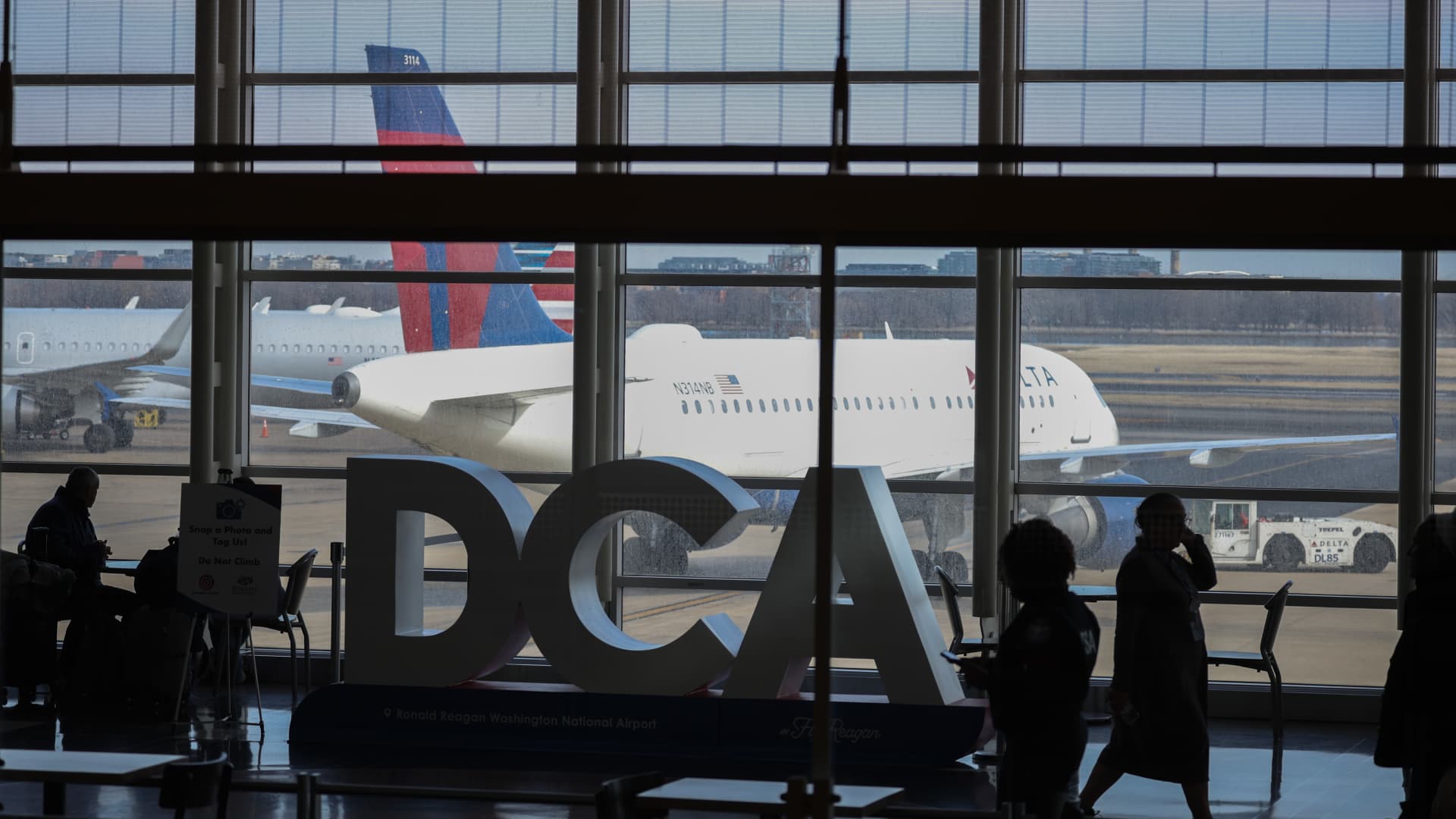 Delta Air Lines -lentokone on hinattu paikalleen valmistautumaan lentoonlähdön Reaganin kansallisella lentokentällä sen jälkeen, kun American Airlinesin lentokone kaatui lähestymistapaan lentokentälle, Arlingtonissa, Virginiassa, 30. tammikuuta 2025.