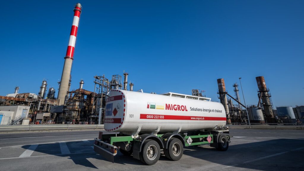 Tämä valokuva esittää Cressier’sin jalostamoa, jota operoi Varopreem, Sveitsin ainoa edelleen toiminnassa oleva öljynjalostamo, Cressierissä 18. maaliskuuta 2026.