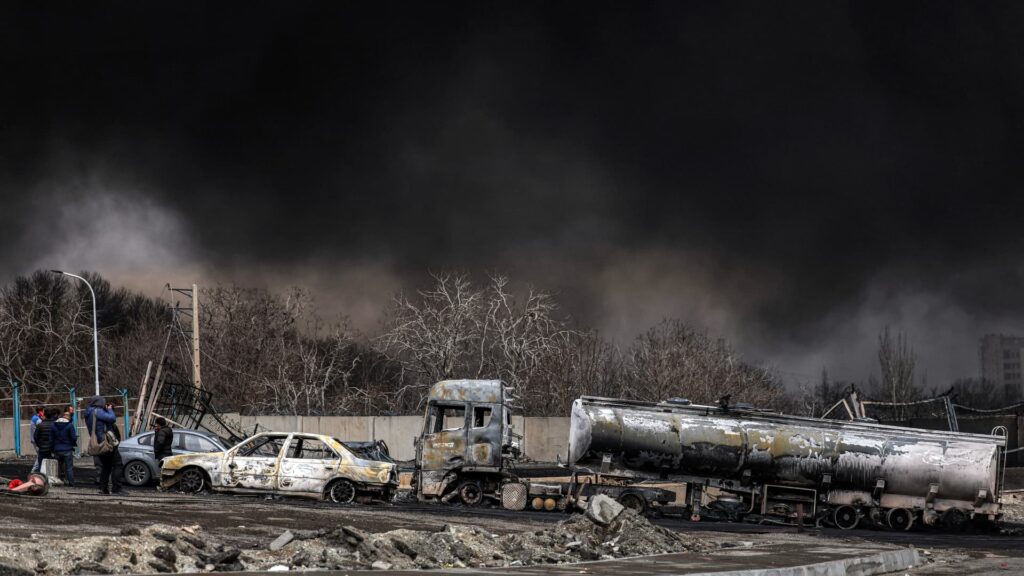 Tumma savupilvi peittää tuhoutuneita ajoneuvoja lähellä meneillään olevaa tulipaloa sen jälkeen, kun Shahranin öljynjalostamoon tehtiin yön yli Teheranin luoteisosassa 8.3.2026.