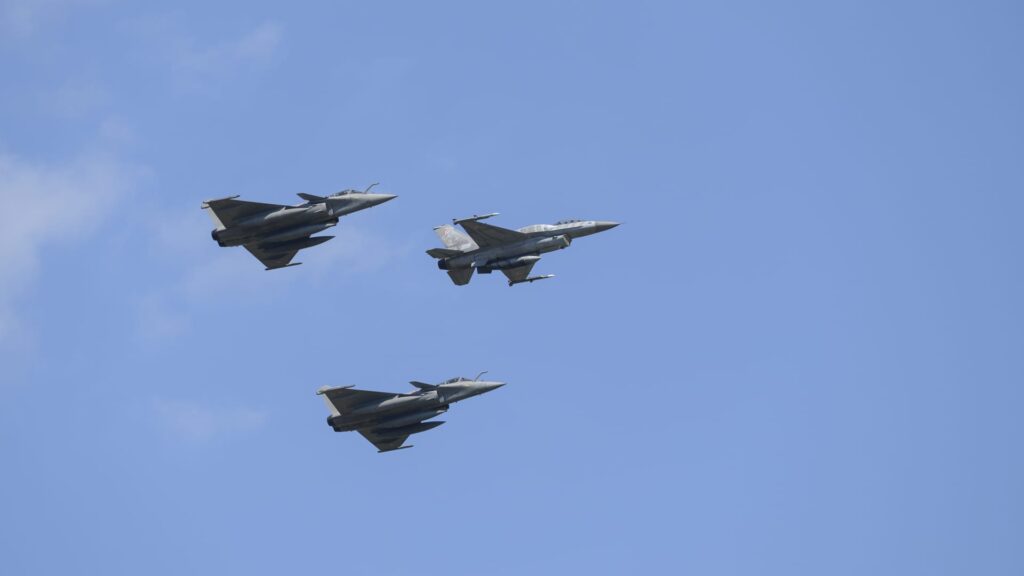 Dassault Rafale -hävittäjälentokoneet reunustavat puolalaisen ilmavoimien F-16 molemmin puolin, kun he suorittavat ylittävän kansallisen armeijan päivän sotilaallisen paraatin aikana Varsovassa, Puolassa, 15. elokuuta 2025.