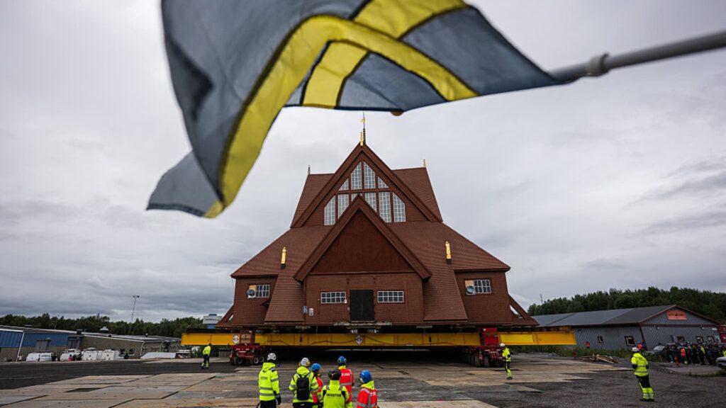 Tässä ilmakuvassa Kiirunan Kyrkan kirkko kuljetetaan maanteitse uuteen paikkaan 20.8.2025 Kiirunaan, Ruotsiin. 672,4 tonnia painava kirkko kuljetetaan kokonaisuutena uuteen paikkaan 3 km:n päähän LKAB:n rautakaivoksen aiheuttamien vahinkojen välttämiseksi.