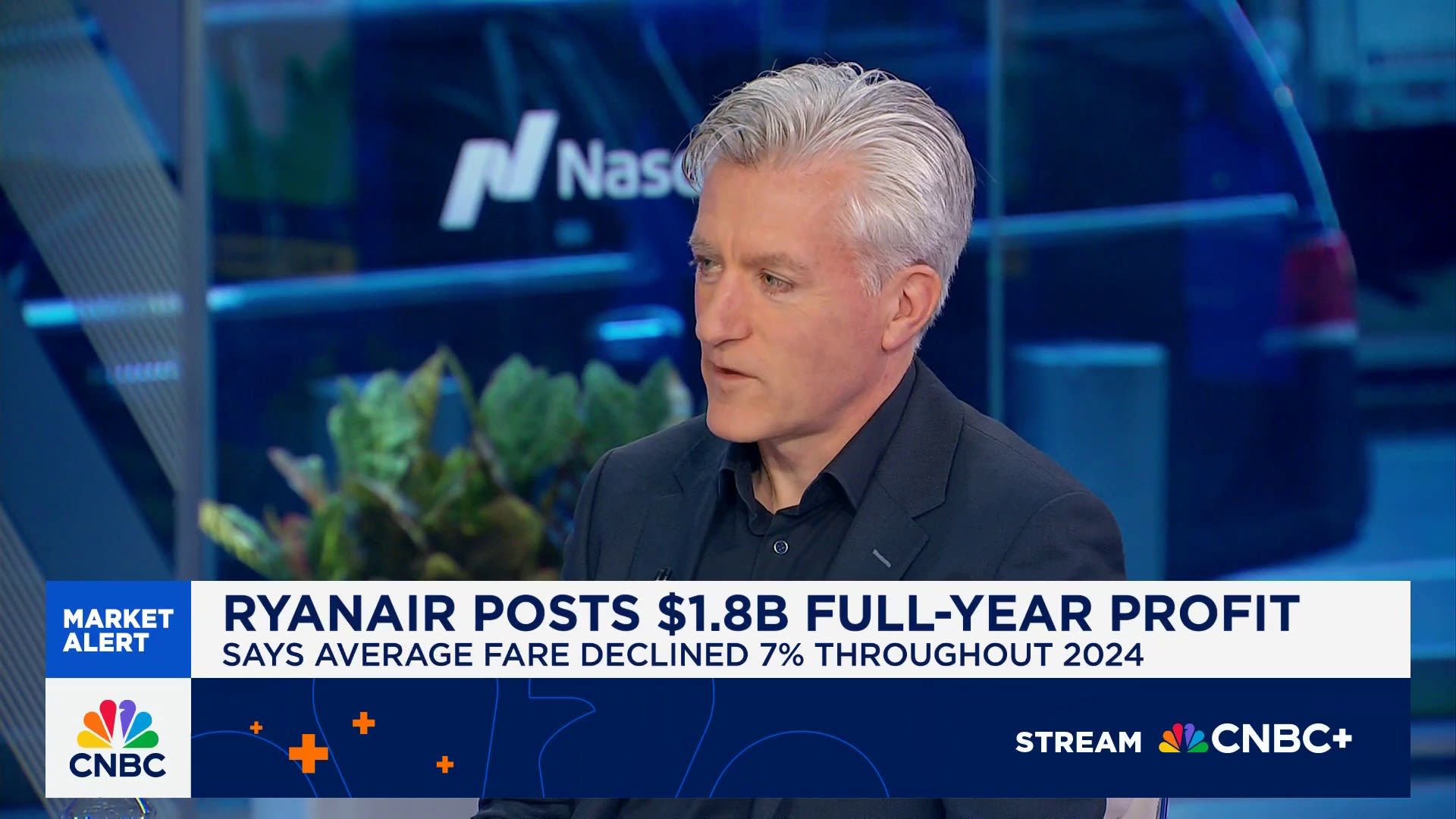 Share Facebook Twitter LinkedIn Pinterest Email Copy Link JakaaJaa artikkeli Facebookin kauttaJaa artikkeli Twitterin kauttaJaa artikkeli Linkedinin kauttaJaa artikkeli sähköpostitse Ryanair-konsernin talousjohtaja Neil Sorahan liittyy Squawk Boxiin keskustellakseen yrityksen koko vuoden voitosta, kesämatkakysynnän näkymistä, tariffien vaikutuksista Boeing-toimituksiin ja paljon muuta.