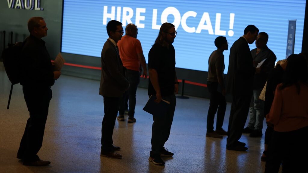 Työnhakijat osallistuvat Mega JobNewsusa South Floridan työmessuihin, jotka pidettiin Agerant Bank Arenalla 25. syyskuuta 2025 Sunrise, Floridassa.