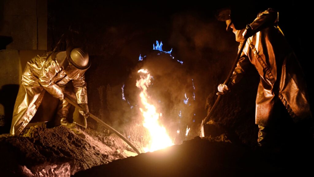 Saksalaisen teräsvalmistajan Salzgitter AG:n työntekijät seisovat uunin edessä tehtaalla Salzgitterissa Saksassa 1.3.2018.