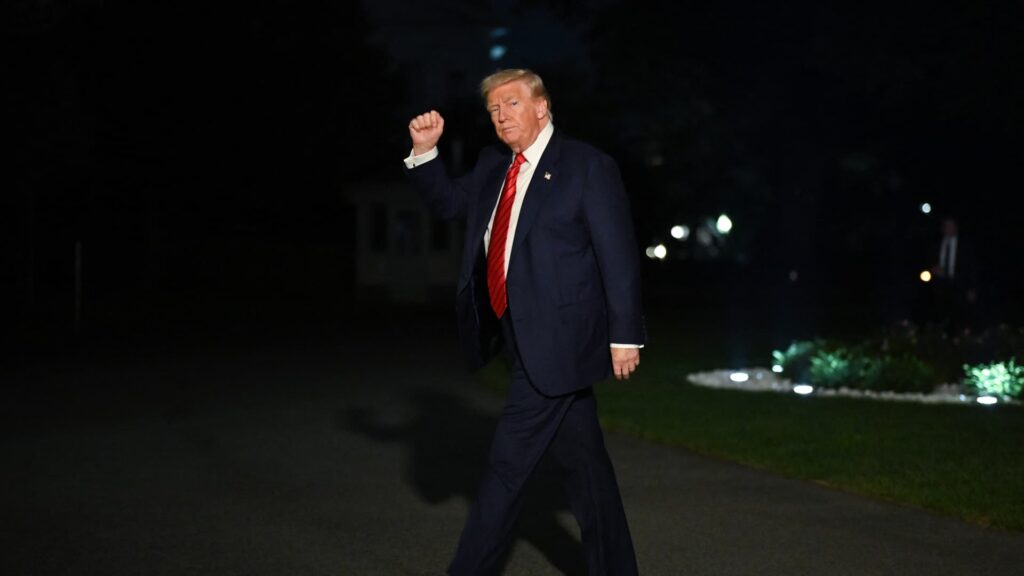 Yhdysvaltain presidentti Donald Trump nostaa nyrkkinsä saapuessaan Valkoiseen taloon Washington DC: hen 3. elokuuta 2025 vietettyään viikonlopun Bedminsterin asuinpaikassaan.