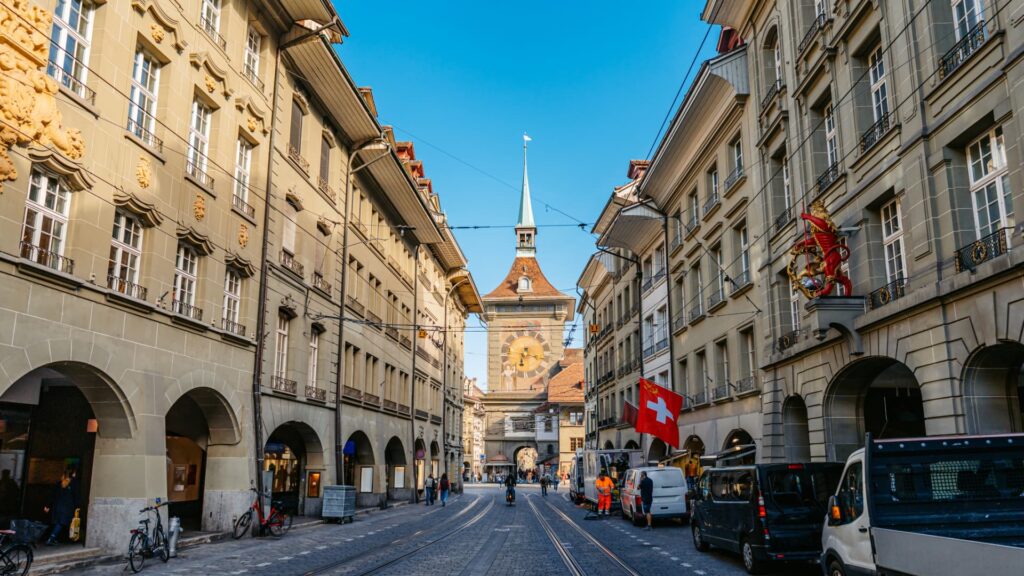 Zytgloggeen (kellotorniin) johtava katu Bernissä, Sveitsissä.