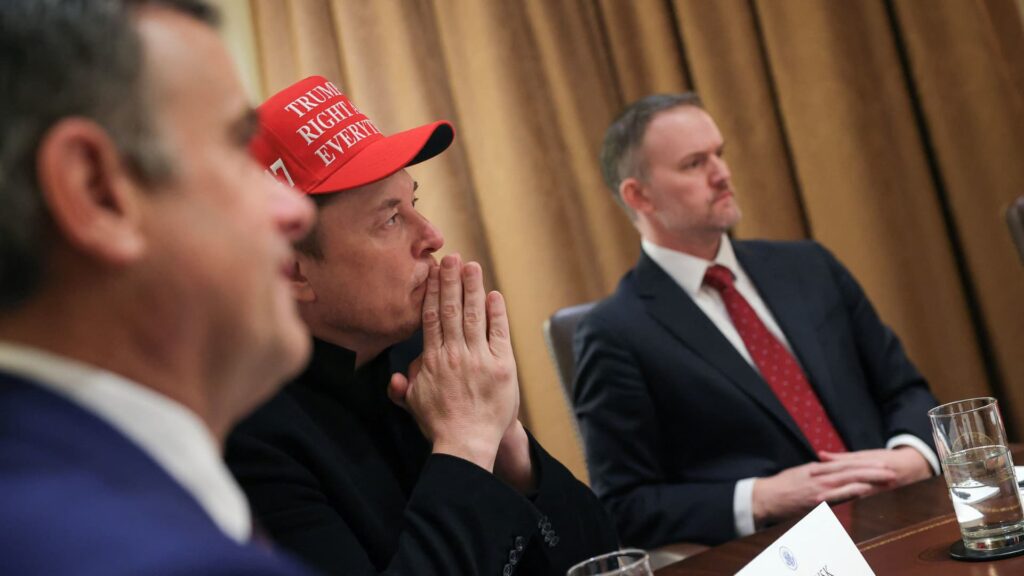 Teslan toimitusjohtaja Elon Musk käytti “Trump on oikea kaikelle!” Hattu, hän, Yhdysvaltain kaupan edustaja Jamieson Greer ja CIA: n johtaja John Ratcliffe osallistuivat kabinetin kokoukseen Valkoisessa talossa Washingtonissa, D.C., USA 24. maaliskuuta 2025.