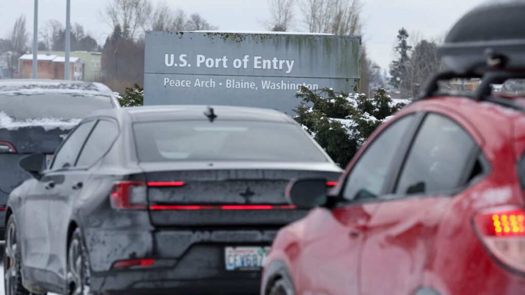 Autojono on ylittänyt Yhdysvaltojen kahden maan ja Salin, British Columbian, Kanadan, 3. helmikuuta 2025 väliseltä rajalta.