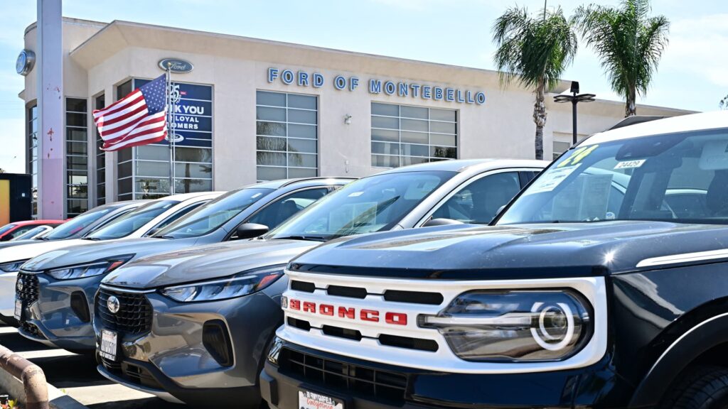 Ajoneuvot, jotka nähdään Fordin autokaupassa Montebellossa, Kaliforniassa, 1. huhtikuuta 2025.
