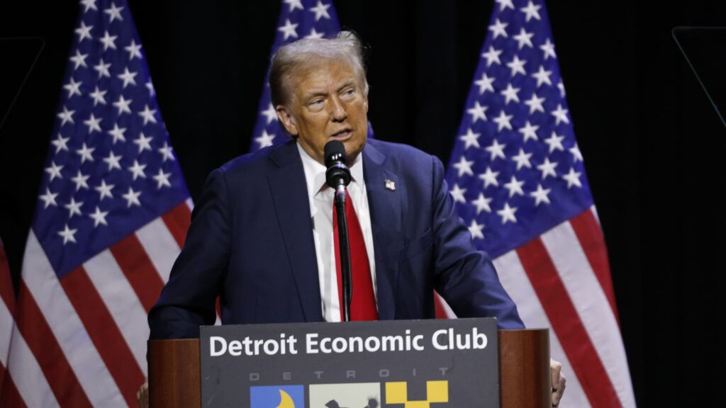 Republikaanien presidenttiehdokas ja Yhdysvaltain entinen presidentti Trump pitää puheen Detroit Economic Clubissa 10. lokakuuta 2024 Detroitissa, Michiganissa.