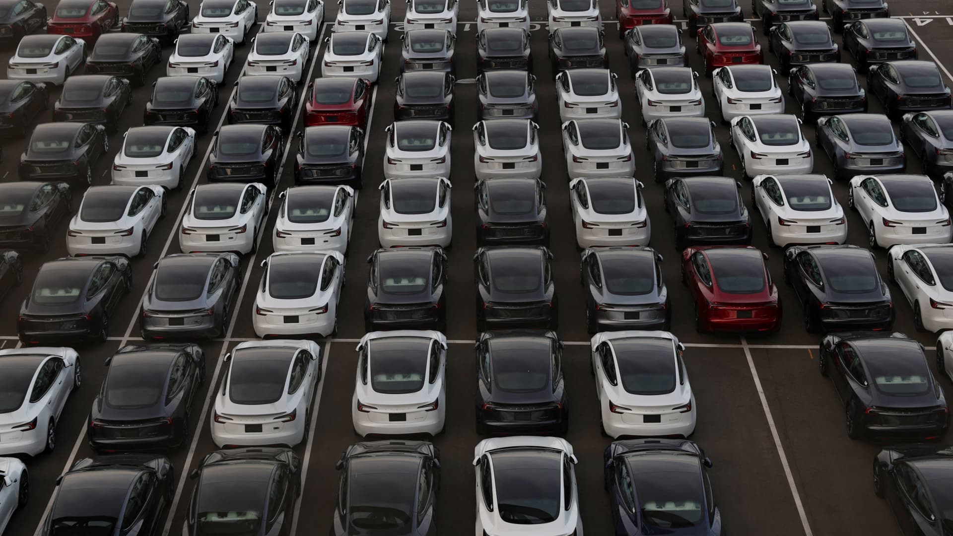 Tesla -ajoneuvot, jotka oli rivissä ajoneuvojen varastointipihalla teollisuussatamassa päivänä, kun Yhdysvaltain presidentti Donald Trump saavutti kauppasopimuksen Japanin kanssa, joka vähensi automaattisen tuonnin tariffeja Yucomassa, lähellä Tokiota, Japania 23. heinäkuuta 2025.