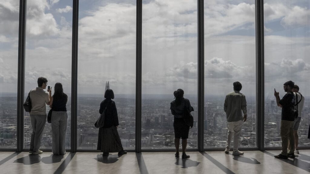 Ihmiset suhtautuvat Lontooseen pilvenpiirtäjän yläosasta 15. heinäkuuta 2025.