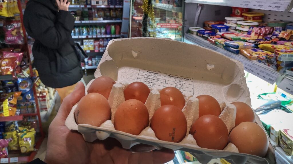Asiakas pitelee kananmunia Moskovan kaupassa 11. joulukuuta 2023. Munien hintojen nousu korkean inflaation ja talouspakotteiden taustalla huolestuttaa Venäjän viranomaisia, varsinkin kun ne ovat keskeinen ainesosa vuoden lopun juhlat. Munien hinnat nousivat marraskuussa Venäjän tilastokeskuksen (Rosstat) mukaan 40,29 % vuodentakaisesta ja ylittivät useilla Venäjän alueilla 100 ruplaa (noin euro) kymmeneltä, mikä on ennennäkemätön nousu. (Kuva: Alexander NEMENOV / AFP) (Kuva: ALEXANDER NEMENOV/AFP Getty Imagesin kautta)