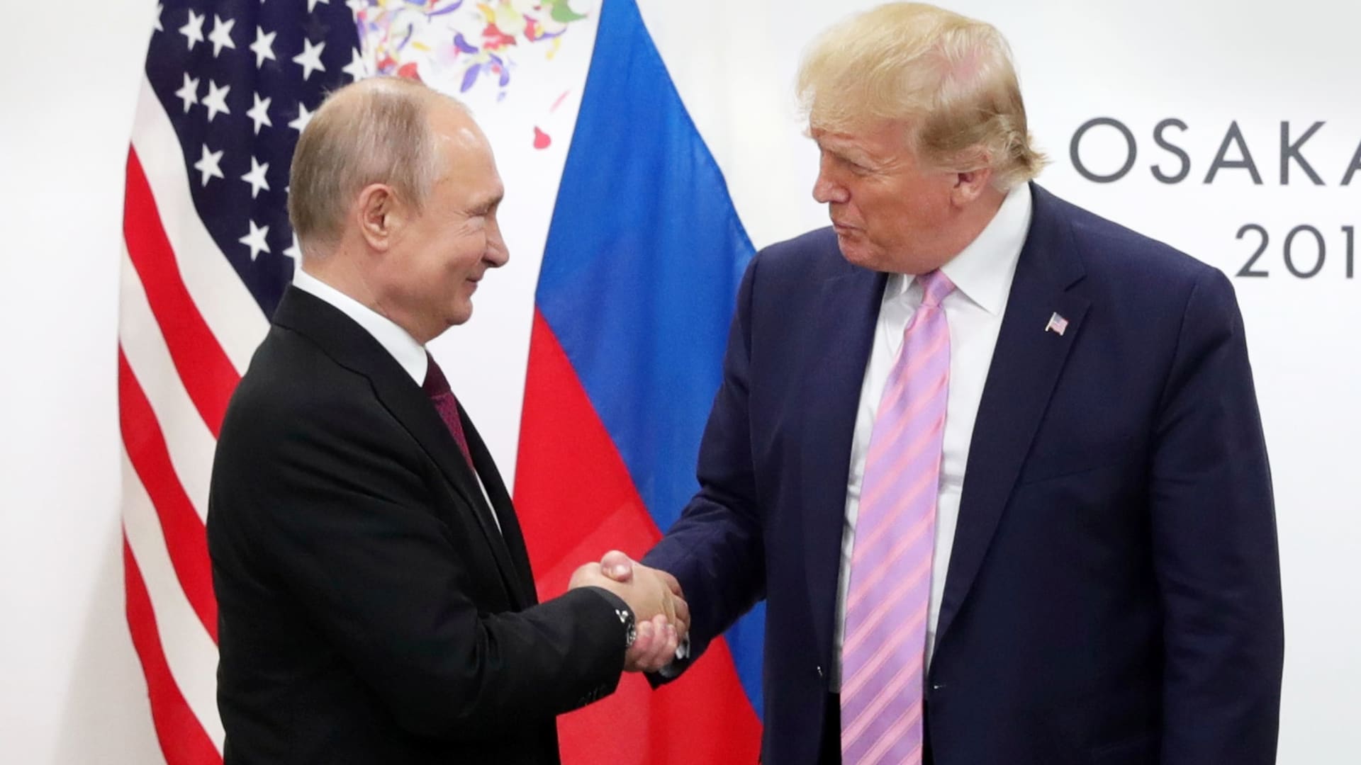 Venäjän presidentti Vladimir Putin kättelee Yhdysvaltain presidentin Donald Trumpin kanssa kokouksessa G20 -huippukokouksessa Osakassa, Japanissa 28. kesäkuuta 2019.