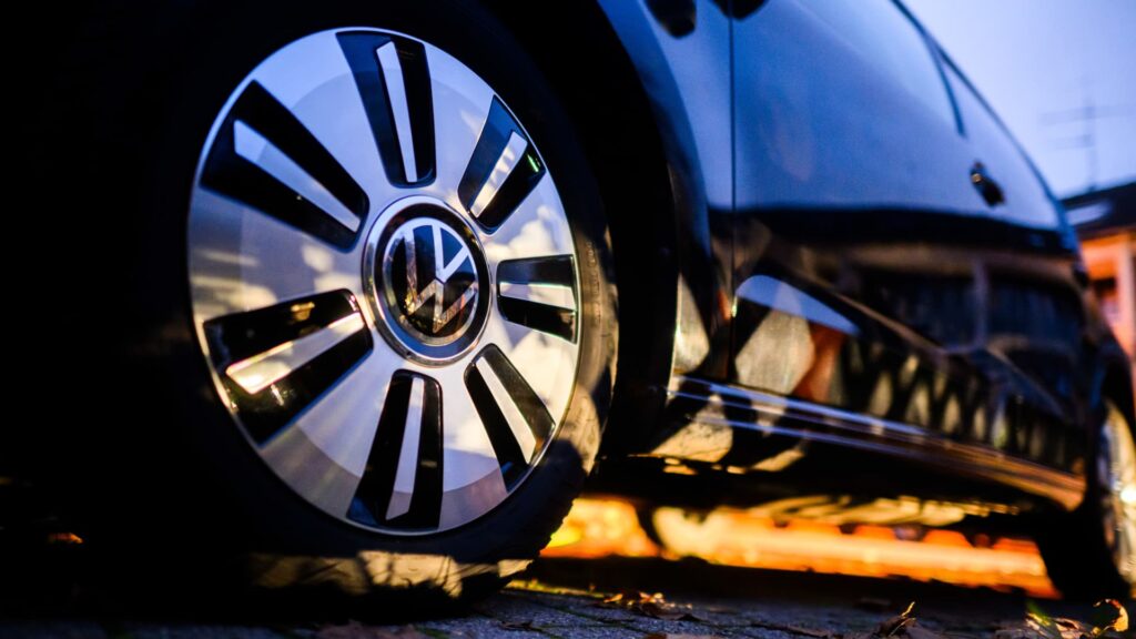 Volkswagen-logo e-upin reunassa. sähköauton rengas.