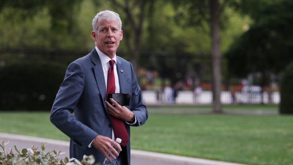 Yhdysvaltain energiaministeri Chris Wright lähtee puhuttuaan televisiohaastattelussa Valkoisen talon ulkopuolella 19. elokuuta 2025 Washingtonissa, DC.